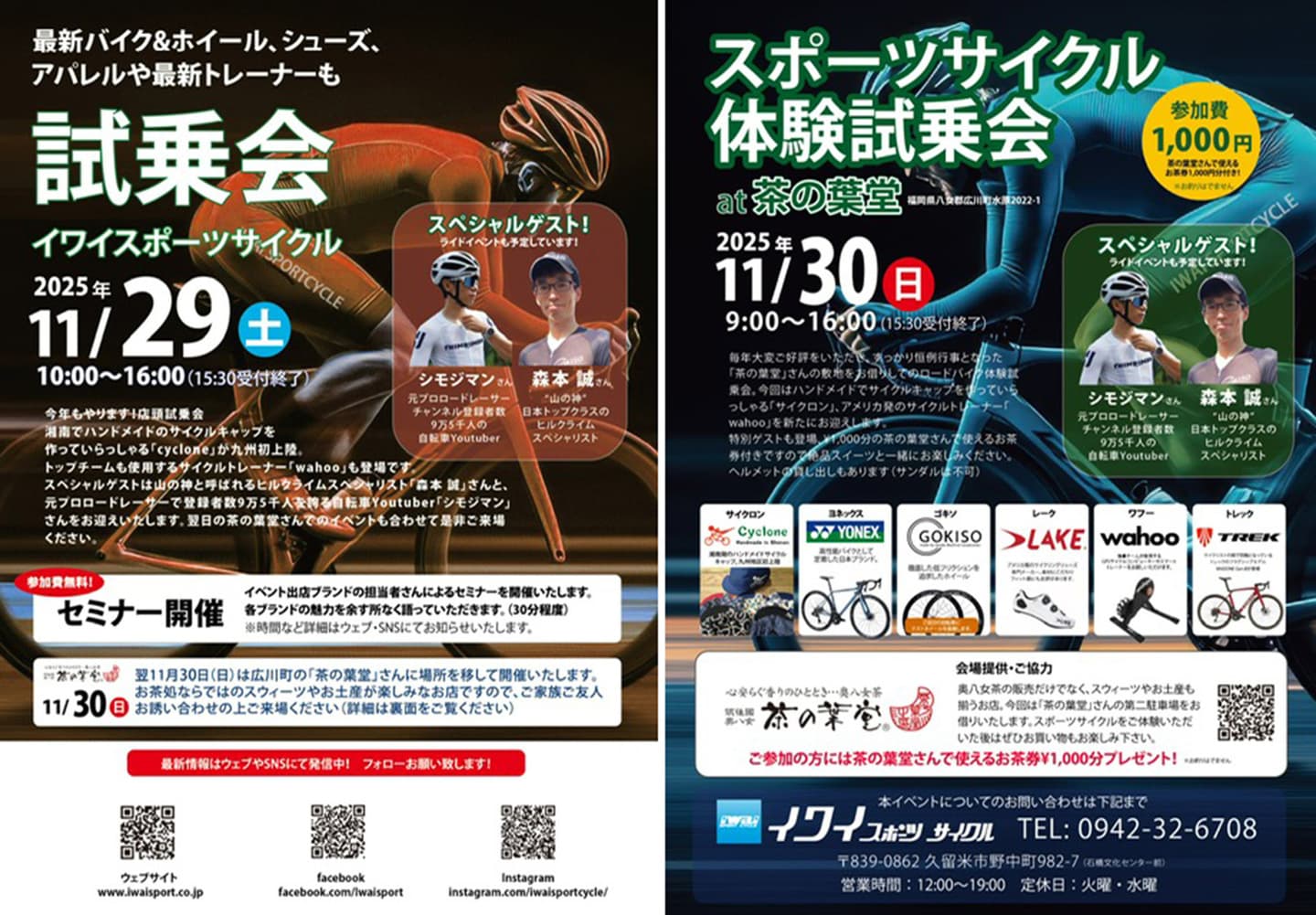 - 当日は八女市広川町の「茶の葉堂」さんでスポーツサイクル体験試乗会を開催しております。